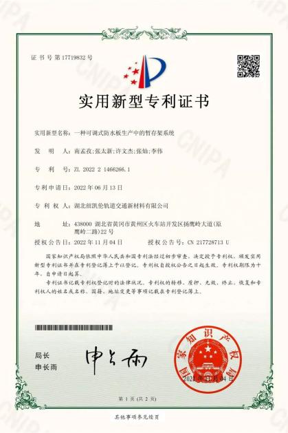 Кроме того, Хубэй Канлон Компания Rail Transit New Material Co., Ltd. также недавно получила 5 патентных свидетельств на полезную модель, выданных Государственным ведомством интеллектуальной собственности. .Они есть оборудование дозатора на основе обработки гидроизоляционных и дренажных досок;бак для клея для производства водостойких плит с функцией соскабливания клея;узел вспомогательного прижимного ролика для измерения толщины при обработке водонепроницаемых плит;регулируемая водонепроницаемая доска. Система стеллажей для временного хранения в производстве;система охлаждения и формовки для обработки водонепроницаемых и дренажных плит.