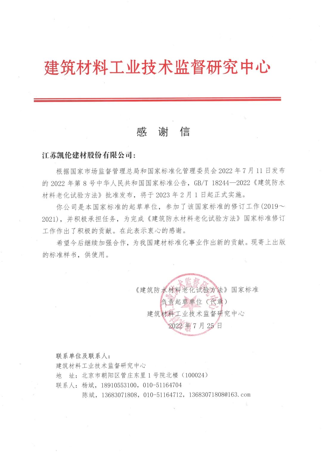 Недавно был официально выпущен национальный стандарт «Метод испытания на старение строительных водонепроницаемых материалов», совместно отредактированный Canlon.В качестве одного из составителей проекта компания Canlon участвовала в пересмотре национального стандарта и получила благодарственное письмо от Центра технического надзора и исследований в области строительства. Промышленность материалов.