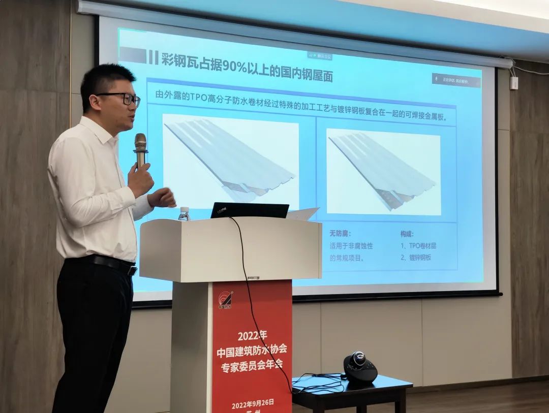 Г-н Шан Юншэн, директор Центра исследований и разработок Canlon, поделился темой «Исследования и разработки и инженерная практика мембранного композитного металлического листа TPO» и представил процесс исследований и разработок и процесс проверки интегрированной панельной системы Canlon TMP, а также строительство план и детальная обработка системы.