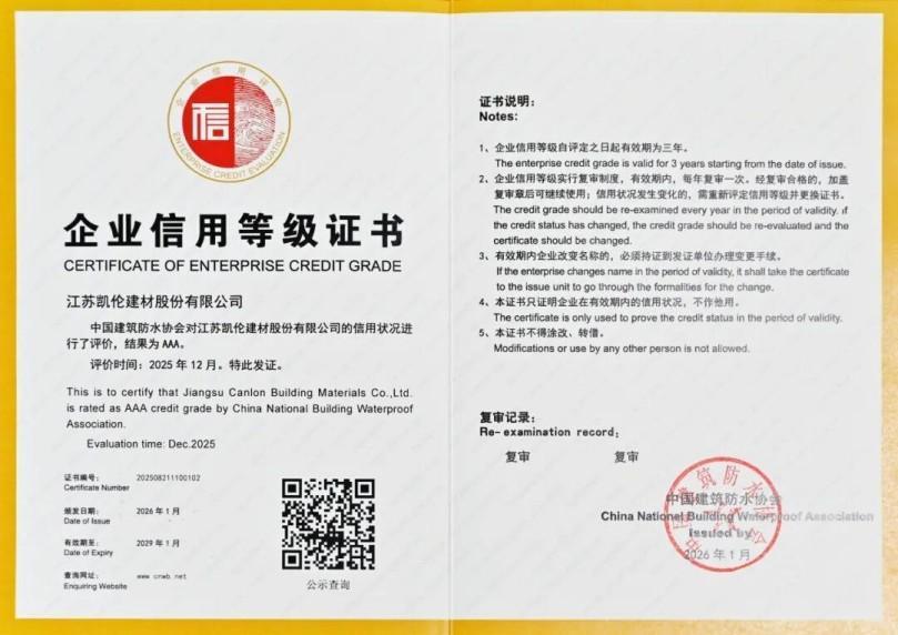 Недавно компания Canlon , благодаря своей всеобъемлющей силе и заслуживающим доверия бизнес-показателям, после тщательной проверки получила высший кредитный рейтинг — AAA — от Китайской ассоциации строительной гидроизоляции. Кредитный сертификат AAA действителен с 2026 по 2029 год. Это не только является признанием корпоративной репутации и ценности бренда Canlon , но также означает образцовую роль компании в содействии построению кредитной системы отрасли. Canlon получает этот самый высокий кредитный рейтинг уже много лет подряд.